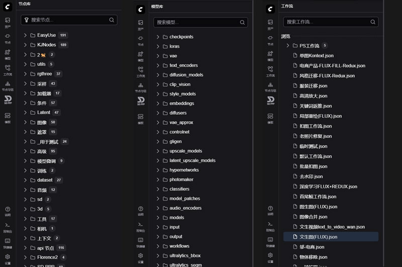 4 | 模型库 (Model Browser) | M | 浏览本地模型文件的可视化面板。它会索引您models文件夹下的所有模型(如Checkpoint、LoRA、VAE等),直接拖动模型名到工作区,即可自动创建对应的模型加载节点。 |