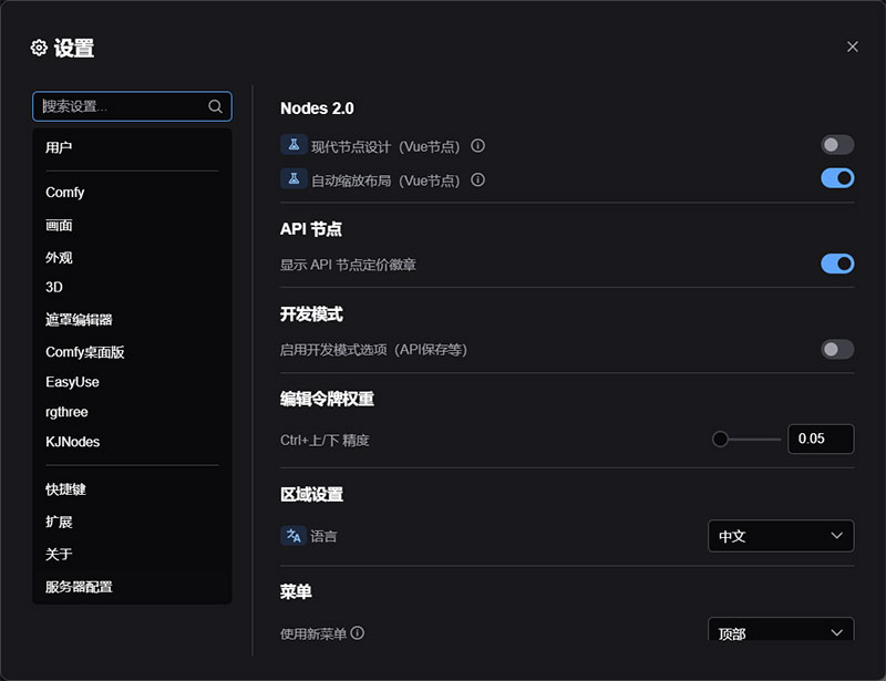 ComfyUI用户界面说明,包含基本操作,菜单设置,节点操作等常见用户界面选项等,但是由于 ComfyUI 版本更新频繁,内容可能存在滞后,请以实际界面为准,此教程以ComfyUI desktop V0.6.0 为基础进行介绍界面相关功能。目前 ComfyUI 版本(2025-12-13)语言支持,包括:英语、中文、日语、韩语、俄语等10种语言。在设置中调整您需要的语言。