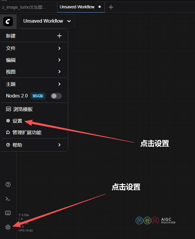 这个部分主要讲解 ComfyUI 设置菜单相关功能,如果你使用新版本(默认)界面,点击屏幕中的齿轮图标,即可打开进入设置菜单,参考下图箭头位置