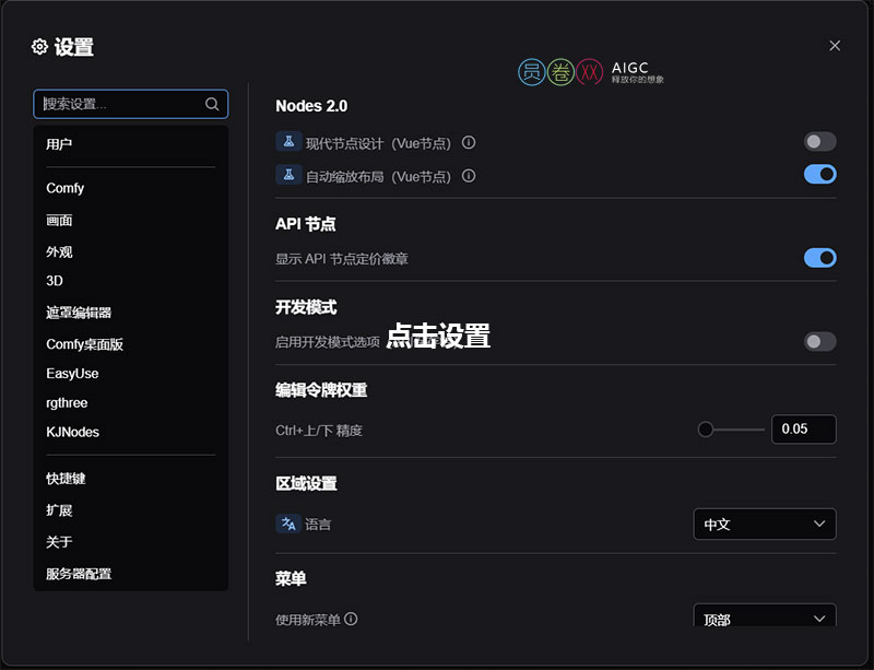 介绍:这个部分主要讲解 ComfyUI 设置菜单相关功能,如果你使用新版本(默认)界面,点击屏幕中的齿轮图标,即可打开进入设置菜单,参考下图箭头位置