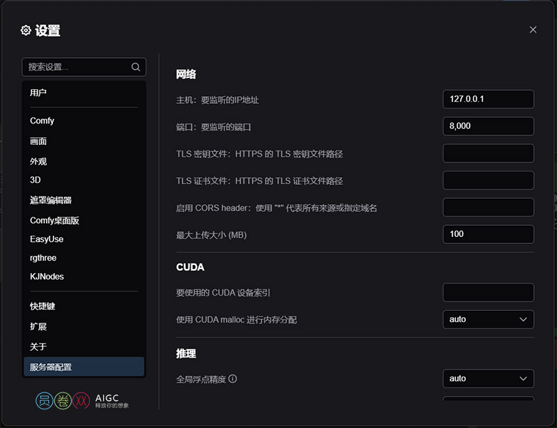 服务配置是在 ComfyUI Desktop 的服务端(主机端)进行配置的,在这里你可以设置 ComfyUI 的局域网访问设置,一些运行的精度设置,以及一些缓存设置等等,由于对应的内容翻译自英文,可能存在一些菜单内容与实际语言设置内容不符,请以实际界面语言为准。