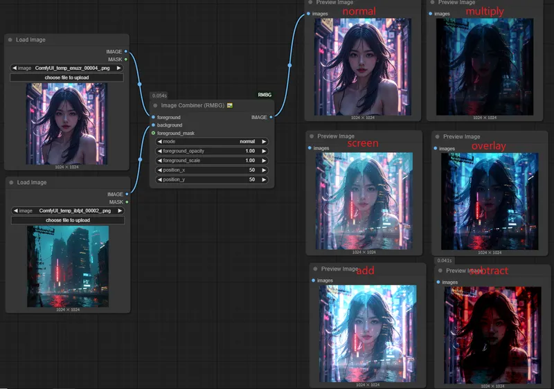 0节点功能:该节点允许用户将前景图像叠加到背景图像上,并提供多种混合模式和位置控制选项。