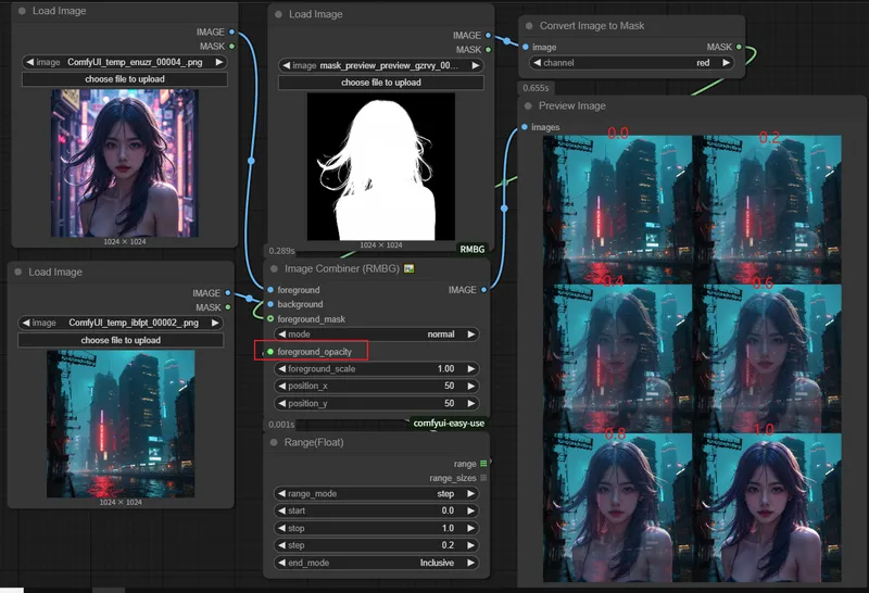 通过以下方式也能达到上面的效果,从这里可以看出,该节点事实上是根据Foreground Mask区域对两张图片进行融合的。当没有输入Foreground Mask时,输入一张RGB图时,它的Foreground Mask是以全白色蒙版替代的。