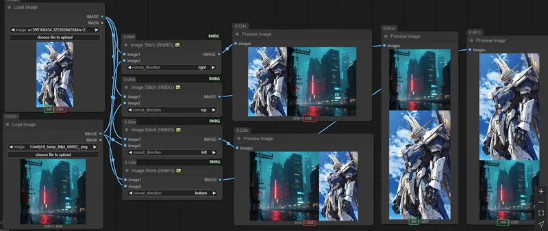 当两张图片尺寸不一样时,节点会自动调整第二个图像的尺寸,以保持其原始宽高比,同时确保与第一个图像的边缘对齐。这是通过以下步骤实现的: