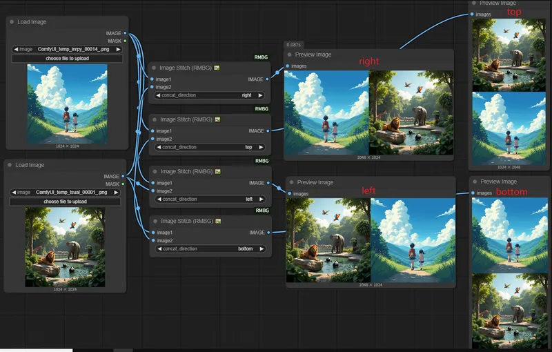 0节点功能:节点允许用户将两个图像按照指定的方向(上、下、左、右)拼接在一起,创建一个组合图像。