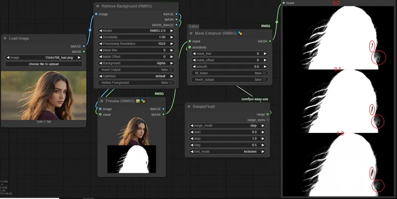 0节点功能:该节点专门用于增强和优化遮罩(mask),精细调整遮罩的质量,包括模糊处理、灵敏度调整、边缘平滑、区域填充等功能。