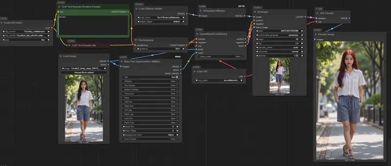 该工作流使用Flux-Fill模型对人物部位进行重绘,如下,则是对人物的头发进行分割,提示词中填充red hair,则把人物的头发变为了红色头发。