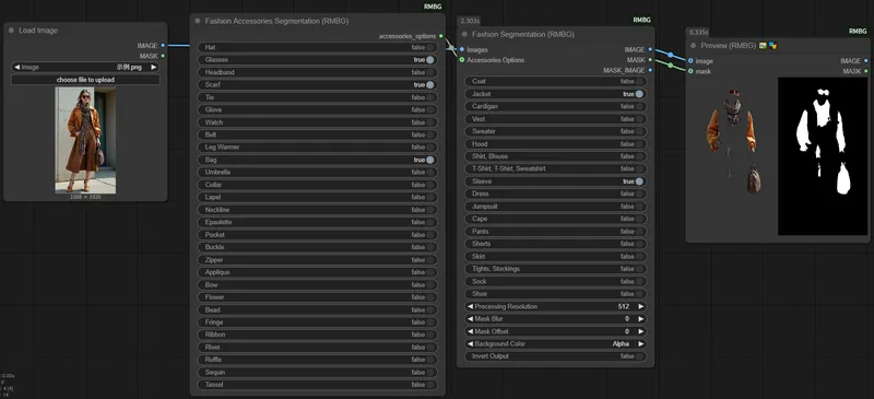 0节点功能:Fashion Segment 节点实际上由两个相互配合的节点组成: 1.FashionSegmentClothing - 用于分割服装项目 2.FashionSegmentAccessories - 用于选择配件选项 这两个节点共同提供了全面的时尚元素分割功能,允许用户精确地提取图像中的服装和配件。