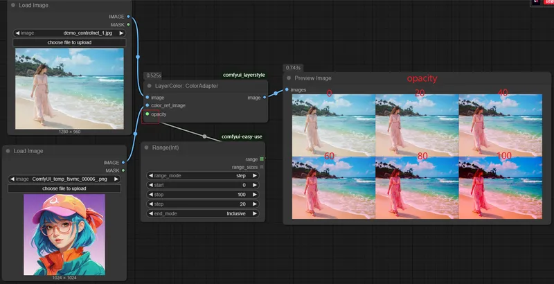 适配强度(0~100),数值越大适配越强,表现越接近参考图。推荐值 60~80;若希望保持目标图风格,仅略作调色,可设为 30 以下。