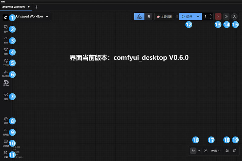 12 | 运行/执行 (Queue Prompt) | Ctrl + Enter | 触发当前工作流运行的按钮。点击后,ComfyUI 将从终点节点开始,依次执行整个工作流图中所有节点的计算。 |