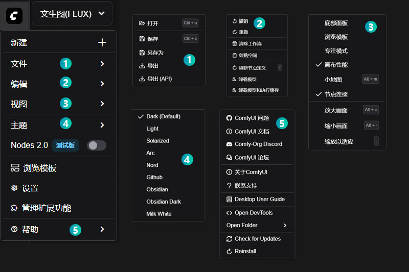 | ComfyUI 的主菜单,包含软件的核心操作功能,如新建/加载/保存工作流、导入/导出、编辑、视频工具、切换主题、打开设置、管理扩展等。 |