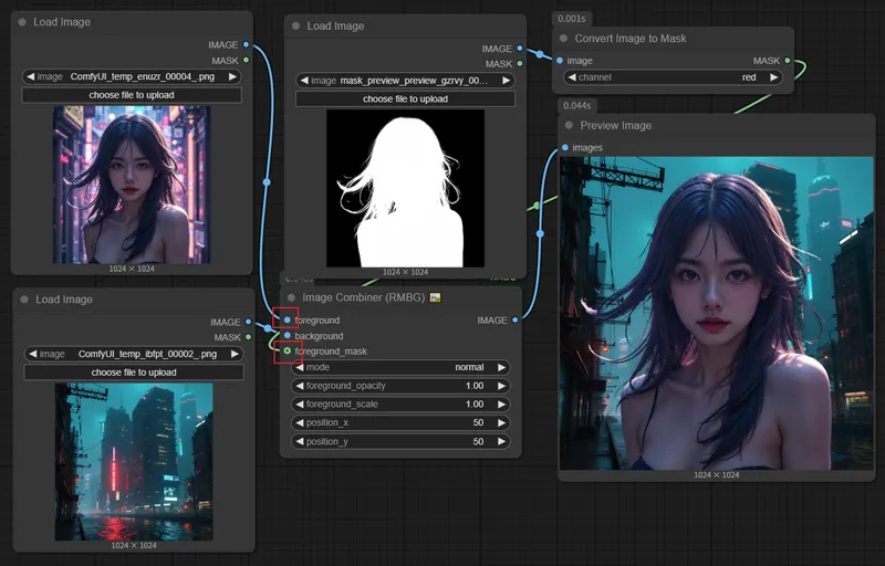 通过以下方式也能达到上面的效果,从这里可以看出,该节点事实上是根据Foreground Mask区域对两张图片进行融合的。当没有输入Foreground Mask时,输入一张RGB图时,它的Foreground Mask是以全白色蒙版替代的。