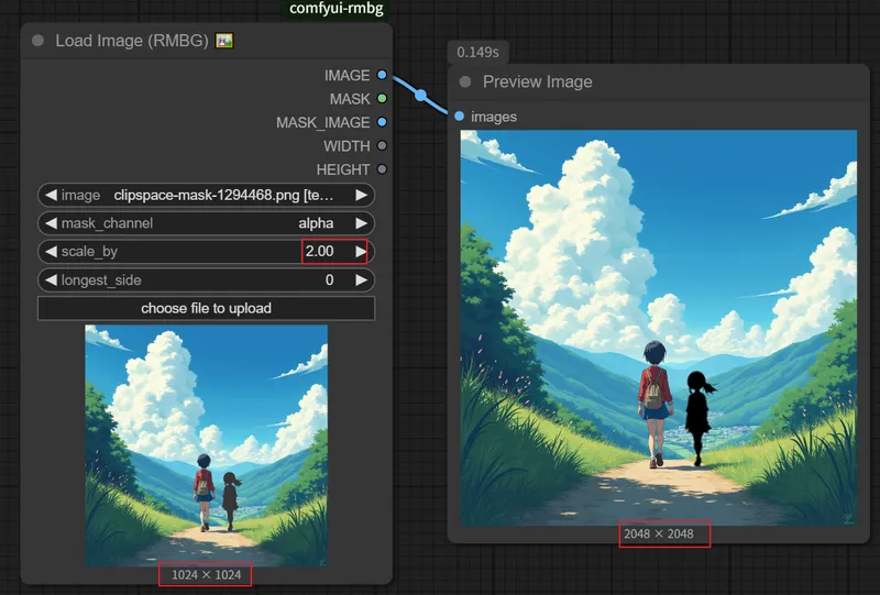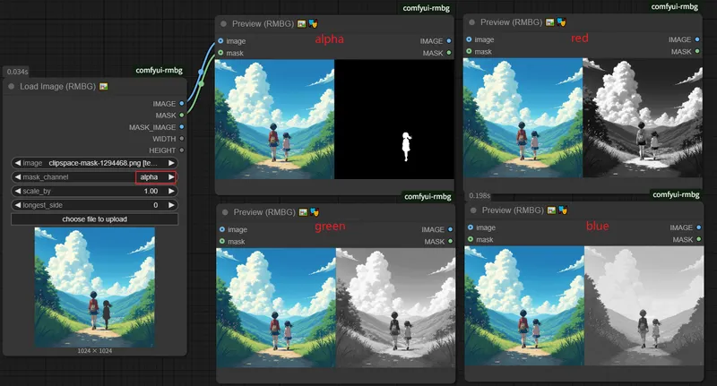 选择从哪个通道生成掩码,支持 alpha, red, green, blue。• 计算公式:new_size = orig_size * scale_by • 仅在size=0时生效 • 使用Image.LANCZOS重采样
