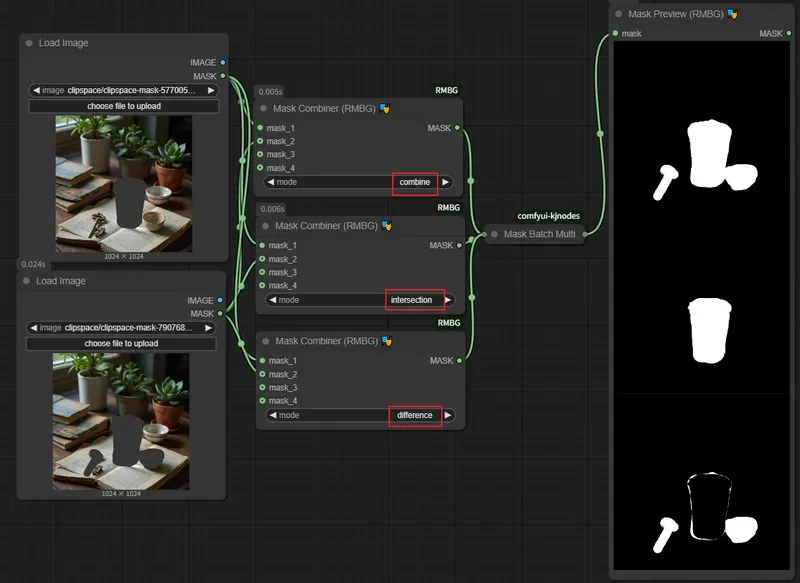 0节点功能:用于将多个遮罩(mask)组合成一个。它允许用户以不同的方式(如合并、交集、差异)组合多个遮罩,创建更复杂的遮罩效果。
