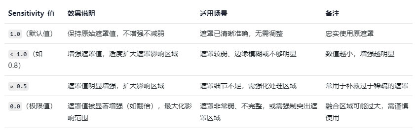 调整掩码检测强度(值越高越“宽松”)。用于微调遮罩识别范围,默认 1.0 可保持原样,小于 1 可抑制遮罩,大于 1 会扩展检测结果。