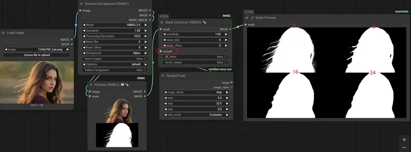 平滑 (Smooth) : 平滑遮罩边缘,值越大,边缘越平滑,但会丢失细节。