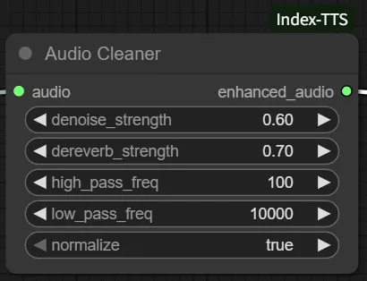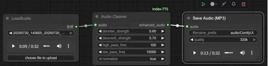0节点功能:对音频进行去噪(降噪)、去混响处理,有助于剔除背景杂音、环境混响等,使嗓音或对话更清楚、自然。还可通过可选参数进一步调整音频频率范围,并进行响度归一化(自动调整音量到标准水平)。