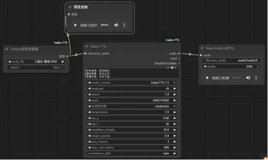 选择的音频文件内容(加载到内存,供下游节点引用,例如TTS、风格克隆、音色检测等)。