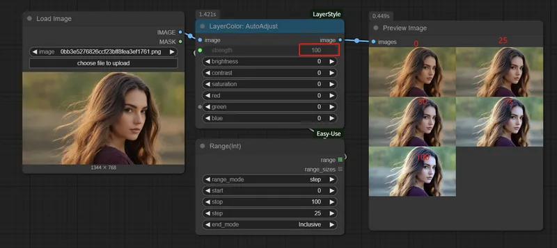 strength:整体调整结果混合强度(0~100),越高越贴近调整后图像。其他参数用法如此。