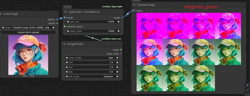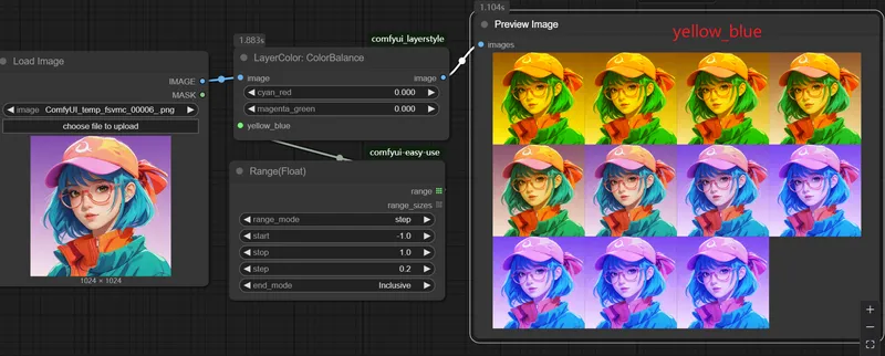 0节点功能:用于调整图像 颜色平衡(Color Balance) ,允许用户独立控制 阴影/中间调/高光 的 青色-红色(Cyan-Red)、洋红-绿色(Magenta-Green)、黄色-蓝色(Yellow-Blue) 三个色彩通道的偏移。适用于色彩校正、风格化调色或修复色偏问题。