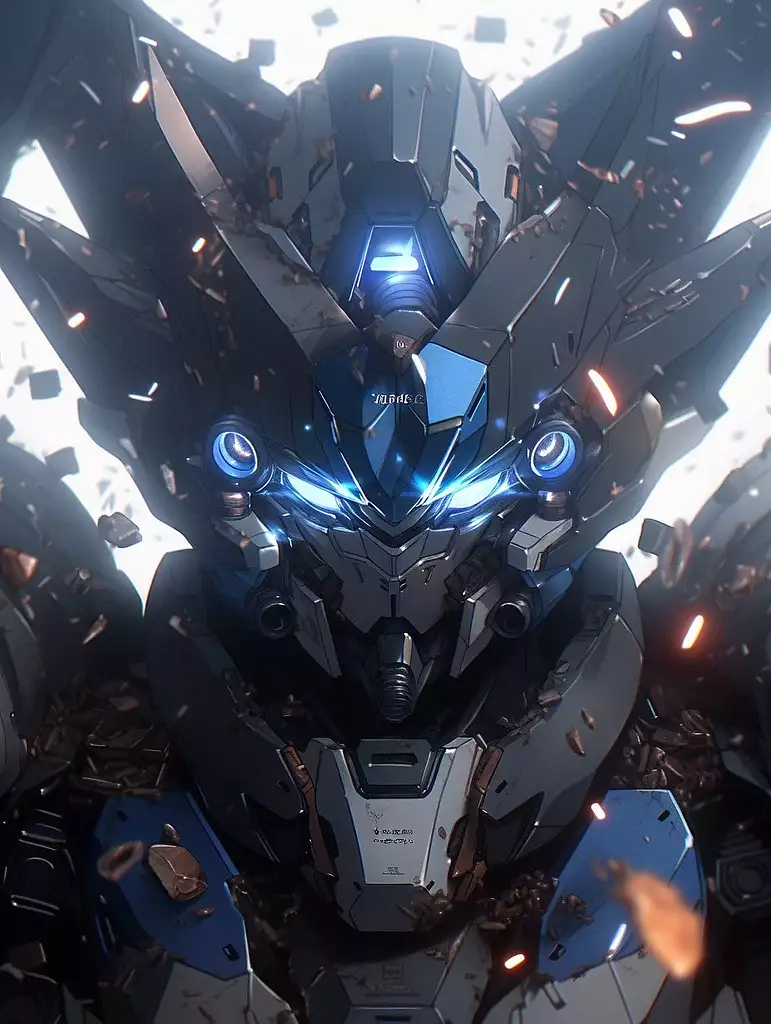 受损的Gudam,蓝色发光的眼睛倾斜,3D,搅拌机,金属材料,背景陨石与砾石相结合,全长拍摄,黑红,蓝白,复杂机甲体积照明,复杂机甲甲,场景照明,逼真,高对比度,精致细节,复杂细节,最高质量,64k