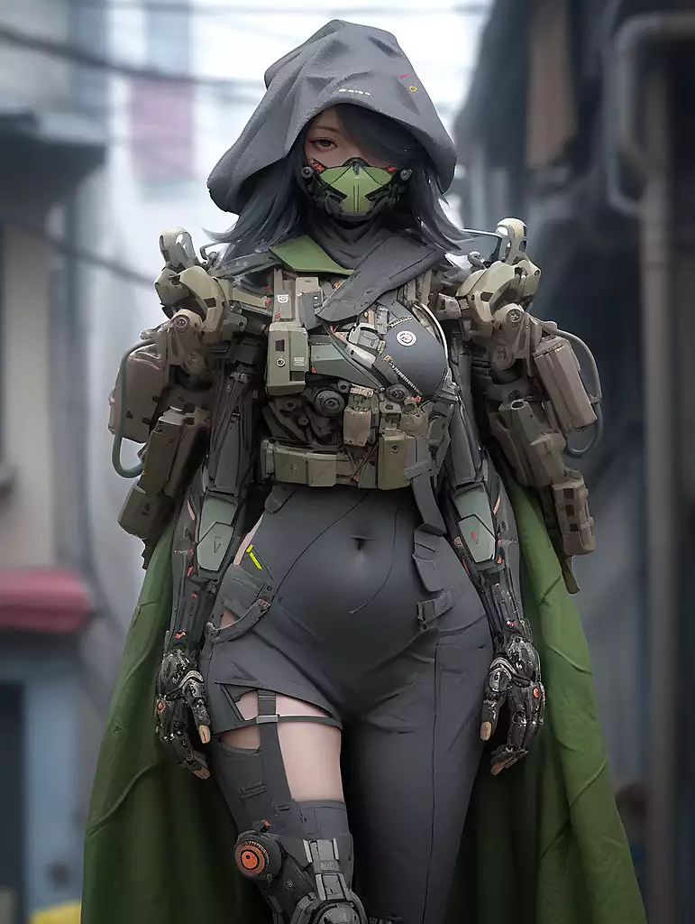 Pretty Japanese female in dystopian attire with mechanical and cybernetic elements in a desolate street,overcast,ruins,cinematic,32k,--ar 9:16 --niji 5 --style expressive