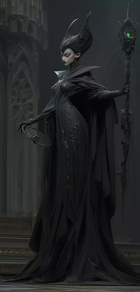 魔法动作捕捉玛莉菲森特·迪士尼角色,一个真正美丽优雅的女人,有着发光的黄色眼睛和猩红的嘴唇,复杂的高形发型,穿着很长的黑色天鹅绒斗篷,她手里拿着魔法杖,背景是王座大厅,华丽,复杂的史诗般的广角镜头,透视黑暗幻想,CGI,深度聚焦,真实感,逼真的细节,复杂,复杂的最大化超现实主义,超高清1080p,总部,CGSociety——niji 5——风格表达——q 2——upanime——ar 640:1344——s 250
