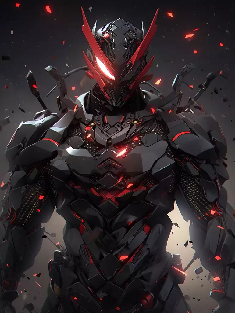 酷炫的铁拳战士,红色发光的眼睛倾斜,3D,搅拌机,金属材料套装,背景陨石与砾石相结合,全长度拍摄,冷光的黑红套装,复杂的机甲体积照明,复杂的机械甲,场景照明,逼真,高对比度,精致的细节,复杂的细节,最高质量,64k-niji 5