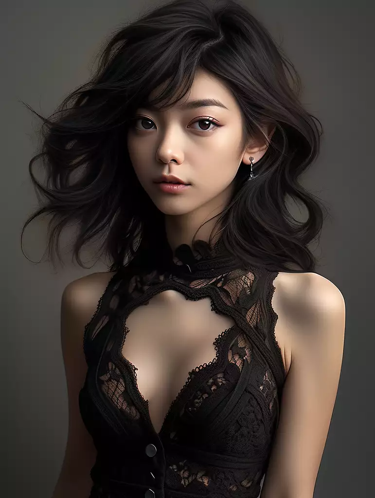 a beautiful Asian woman wearing black lingery,sem sutiã,showing shoulders,posing for a photo,samyang af 14mm f/2.8 rf,bella kotak,photo taken with nikon d750,curvilinear,meticulous details,dark brown and light black,chinapunk,romantic academia,smooth curves,light white and black,--niji 5 --style expressive --s 400