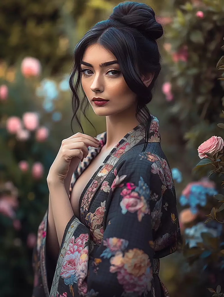 japanese babe in kimono and flower in the garden,in the style of dark silver and navy,fine lines,delicate curves,qian xuan,dark silver and light gold,ready-made,classic hollywood glamour,medieval-inspired,samyang af 14mm f/2.8 rf,photo taken with nikon d750,curvilinear --niji 5 --style expressive