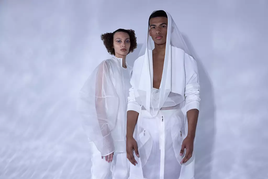 a futuristic fashion photo shoot,modern,clean,create a beautiful image,focus on model and clothing,pay attention to the quality of the image and the proportions of the models' faces and bodies,create depth with light and shadow,add moving lights,light beams,image should be clear and crisp