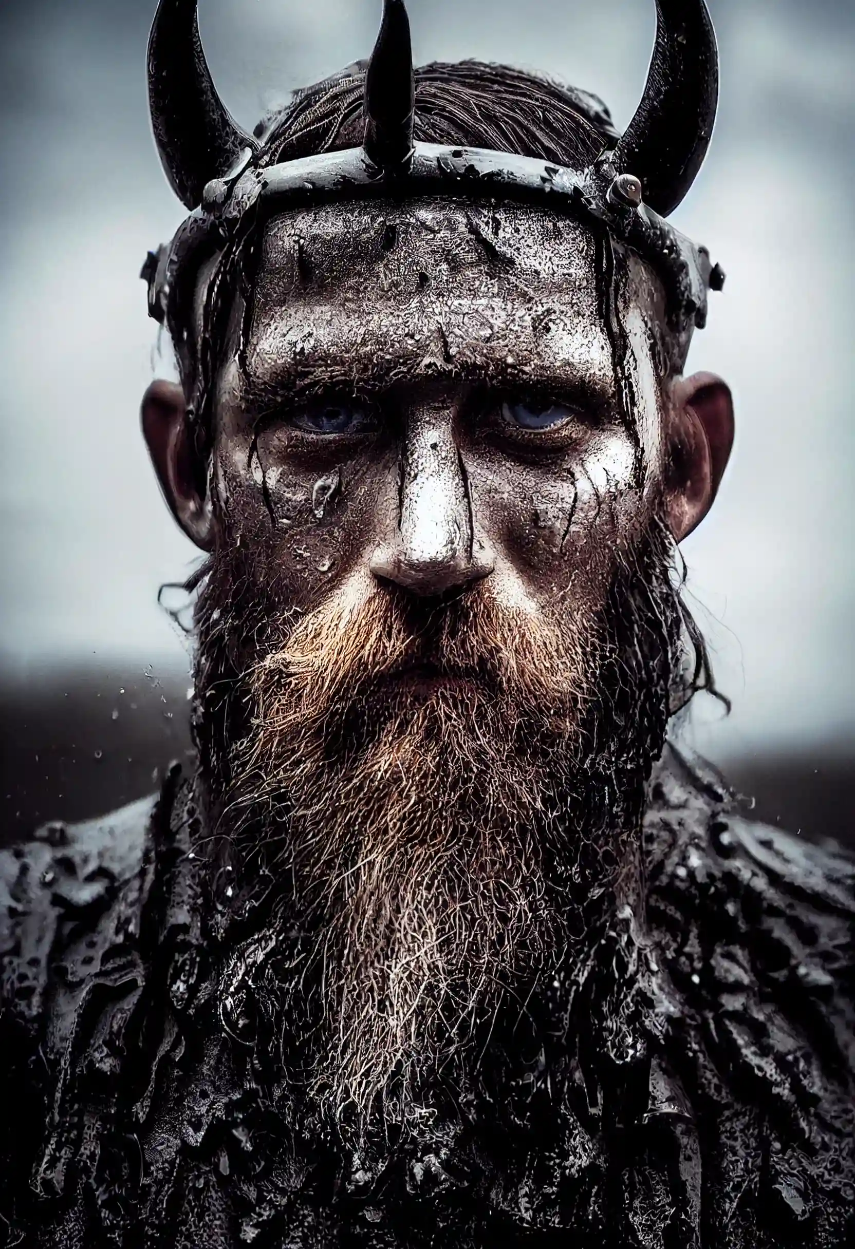 Close-up of Viking King emerging from wet black mud :: Dark metal helmet with two large black horns on the sides of the helmet :: dark warpaint :: scruffy black beard :: angry expression :: scar on face :: Viking Axe :: cinematic lighting,volumetric rays,moody,wet,dripping mud --ar 2:3 --beta --upbeta
