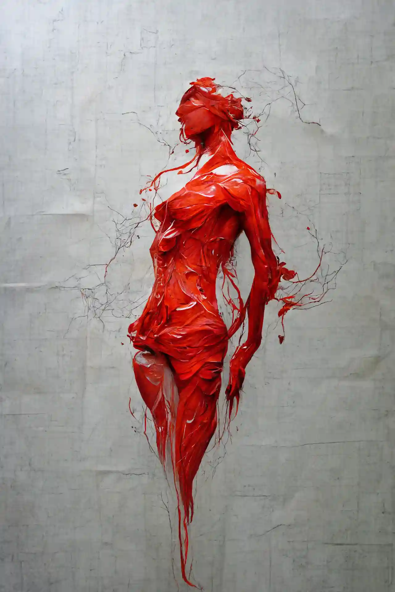 dripping red paint across the shape of a female human,realistic ,high detail,on a white background --ar 12:18