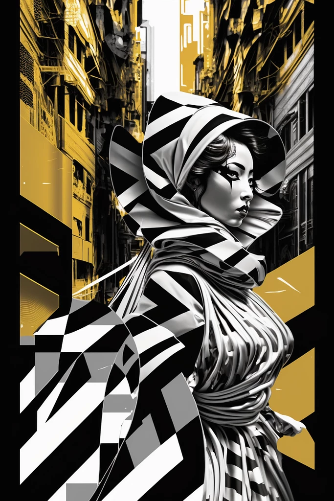 op art,geisha,with hyper-arabic Egyptian style girl in dynamic posture,female model in street of tokyo ,collage,goldblocks,brutalism,Arabic calligraphy graffiti portrait by Christian Hilfgott Brand,behance contest winner,pop surrealism,behance hd,dc comics,reimagined by industrial light and magic gold and silver --ar 2:3 --q 2