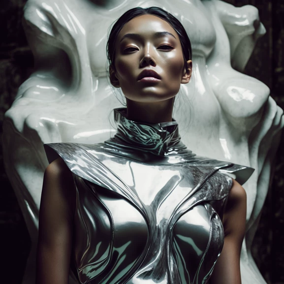 well lit fashion shoot portrait of extremely beautiful female marble statue in a dynamic pose wearing latex outfit by dingyun zhang,yeezy,balenciaga,vetements,a cold wall,sharp focus,clear,detailed,cinematic,detailed,off white,glamourous,symmetrical,vogue,editorial,fashion,magazine shoot,glossy --q 2 --s 750