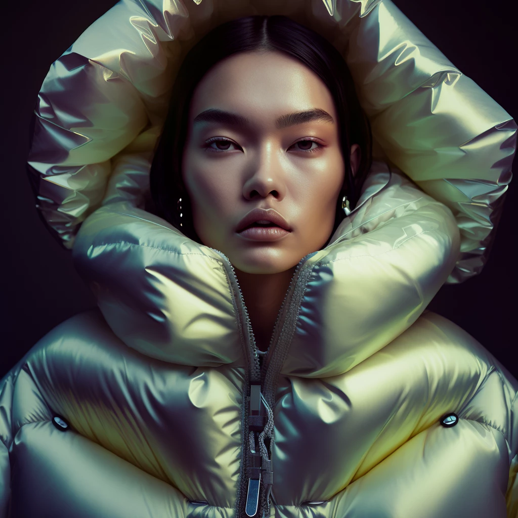 well lit fashion shoot portrait of extremely beautiful female wearing massively over size puffer jacket by craig green,dingyun zhang,yeezy,balenciaga,vetements,sharp focus,clear,detailed,,cinematic,detailed,off white,glamourous,symmetrical,vogue,editorial,fashion,magazine shoot,glossy --q 2