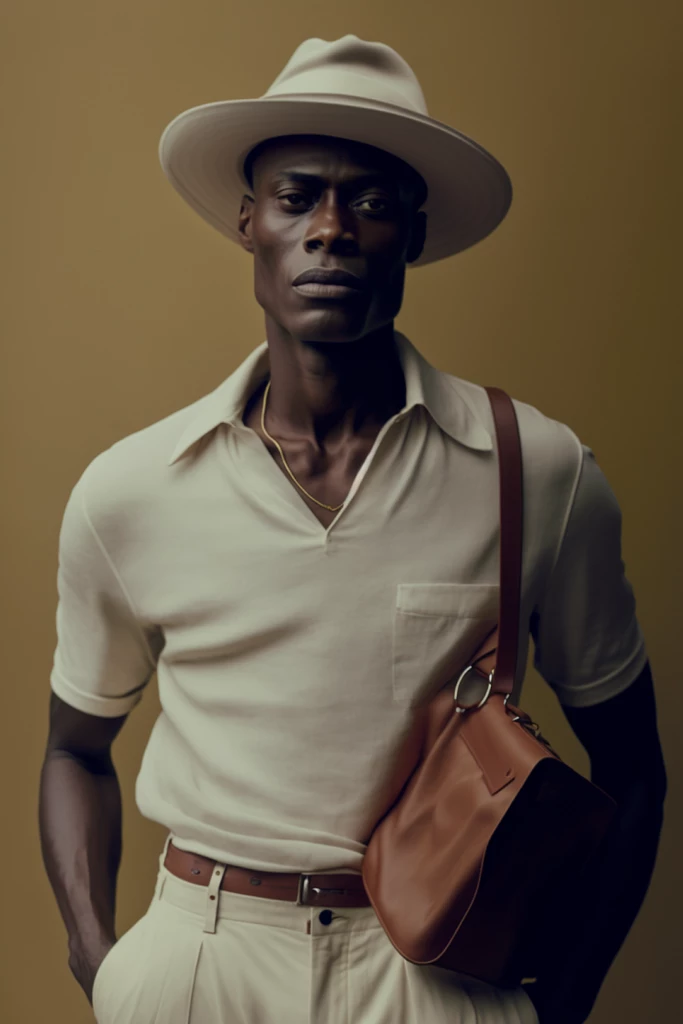 The image depicts a man standing with his hands in his pockets,and is inspired by Eugène Brands.The photo may have been posted on Instagram and was possibly part of an official Dior editorial.The image has a retro color aesthetic and may be associated with summertime.The man in the photo may resemble Lance Reddick and is wearing baggy clothing and a hat.The image may be similar in style to a Hermes ad and could represent 2020 fashion.The image may have been included in a lookbook or profile image for Vogue France.Additionally,the image may have a 50s style influence and was possibly titled "Fromme Seele." --ar 2:3 --q 2