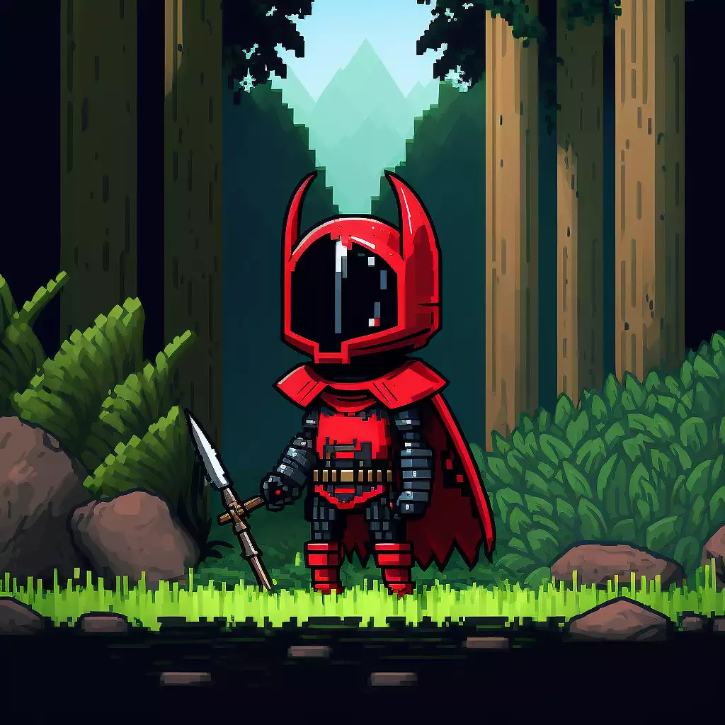 simple 2d pixel art character with a daft punk helmet and red cape,standing in a jungle,in the style of hollowknight