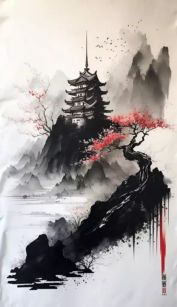 In the foreground lonely sakura on a hill,in the background a Japanese castle,black and red,scroll painting,sumi e drawing,minimalism,luis royo --s 750 --ar 9:16 --no person