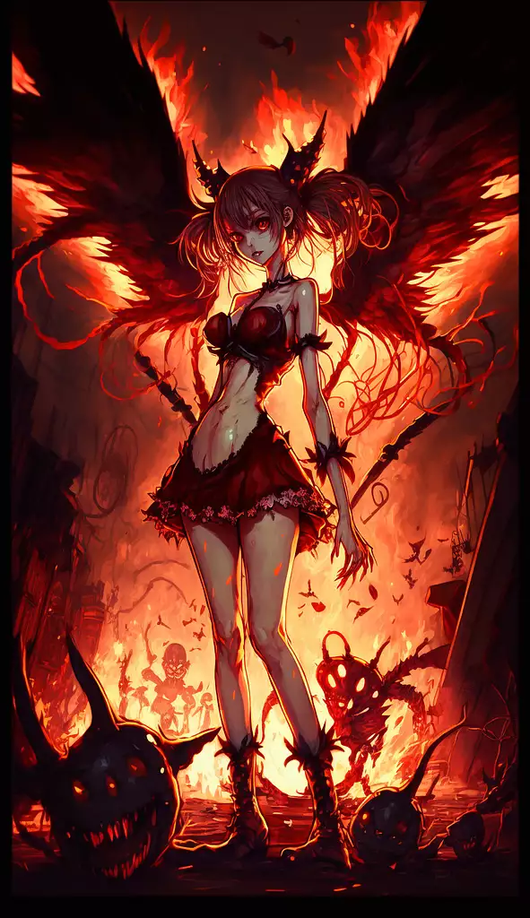 红皮肤的恶魔女孩穿着羊毛内裤,扭角,yuumei艺术家风格,袜子,内裤,恶魔女孩,巨人症,动漫,漫画图形,绘画,红水,背景中的恶魔翅膀,燃烧的房子的背景,很多小细节,超细节,加速,速度,暗曝光,最高质量,最高细节,环境照明,底部第三人称视角,8K,超高清,夜灯--q 2-ar 9:16