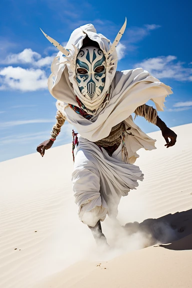 a man running looking at the camera in top of a white sandy dune,wearing a white tribal mask and white oversized clothes,intricate tribal details,dreamy,colorful,bright colors,futuristic,anime style,studio ghibli::2 --ar 2:3 --q 2