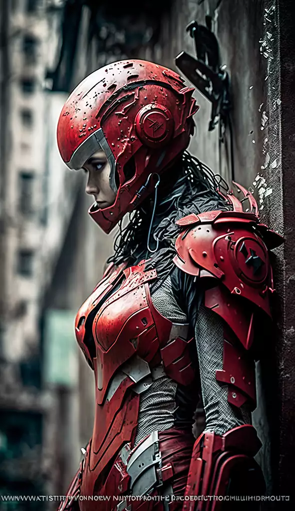 red armed female figure in sci-fi battle armor with cybernetic helmet,aiming on one knee,mask,sci-fi visor,bald head,armed figure,weapon in hand,aiming,plate armor,isolated armor,spacesuit,lots of small details,sci-fi movie style,on a ruined city street,overcast,photography,natural textures,natural light,natural blur,photorealism,cinematic rendering,ray tracing,highest quality,highest detail,Cinematic,Third-Person View,Blur Effect,Long Exposure,8K,Ultra-HD,Natural Lighting,Moody Lighting,Cinematic Lighting --q 2 --ar 9:16