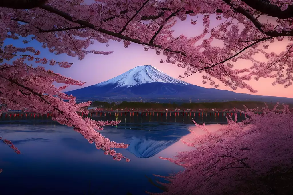 A breathtaking photo of cherry blossoms in full bloom in the foreground,with the majestic Mount Fuji standing tall and proud in the far distance,captured in the distinct style of Takashi Komatsubara.The composition emphasizes the delicate beauty of the cherry blossoms,captured in stunning detail.The vibrant pink petals are illuminated by the cold morning light,creating a beautifull contrast against the deep blue of the sky and the white snow-capped peak of Mount Fuji.Shot with a Canon EOS R camera using a 70-200mm f/2.8 lens,the settings are carefully chosen to achieve optimal exposure and sharpness,with an aperture of f/4.5,ISO 100,and a shutter speed of 1/1600 sec.The image is further enhanced in post-processing,with selective adjustments to color balance,contrast,and saturation,resulting in a mesmerizing and unforgettable work of art.Hyper-detailed,Super-Resolution,UHD,DTM,HDR,8K --ar 3:2 --q 2