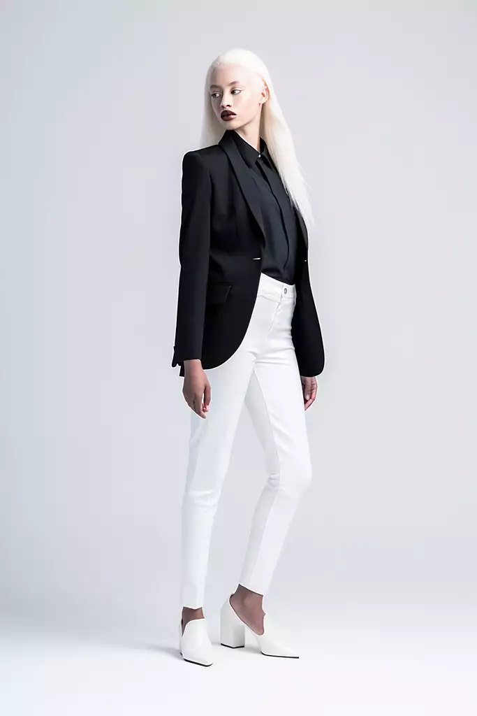 高级工作室时尚全身照,一位令人惊叹的黑色白化女性模特,长相健壮自信,面部轮廓精致鲜明,体格健美。美丽自然,容光焕发,使用最简单的粉底、遮瑕膏和露水般的妆容,重点放在皮肤上。柔和的烟熏眼影突出了眼睛,嘴唇涂成了明亮的深红。他穿着奢华时尚的服装,紧跟着最新的时尚潮流。由一个大的软盒子以45度的角度照亮模特的面部上方和侧面,另一侧有一个较小的反光镜,模特身后和上方有一个发灯,用于照亮背景的背景灯。佳能EOS R5,带佳能EF 85mm f/1.2L II USM镜头和f/2.8光圈--q 5-ar 2:3--v 5-s 500-c 100