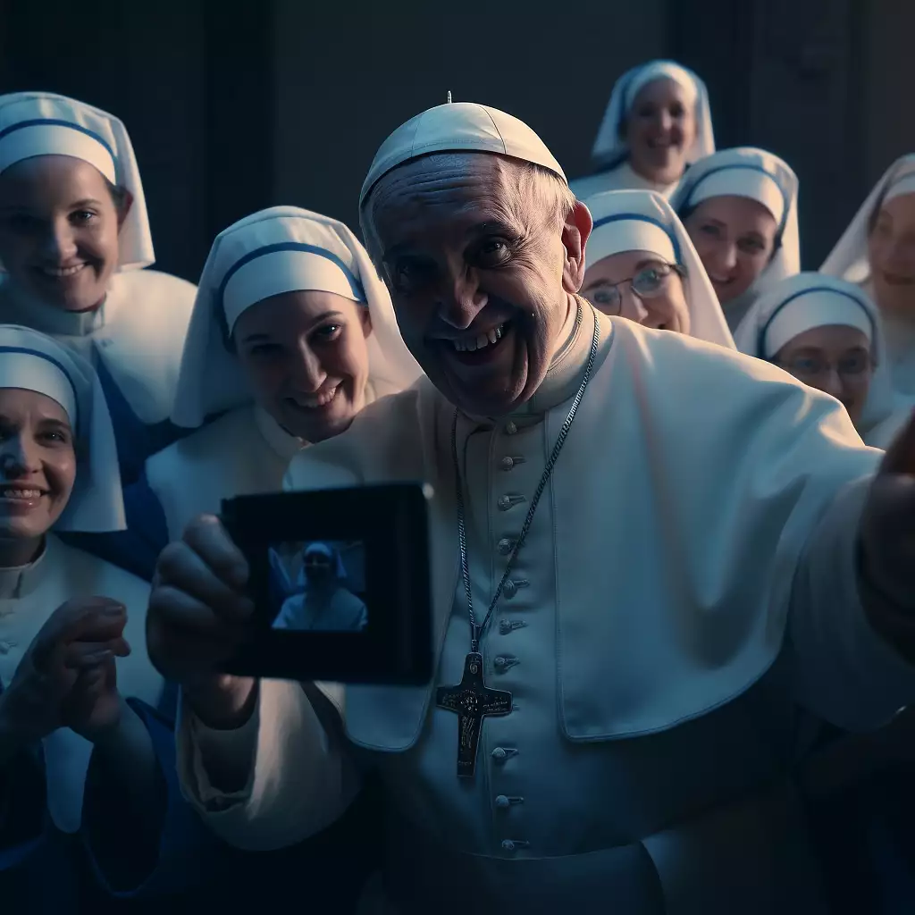教皇弗朗西斯科(pope francisco)作为一名抖音网红,与身后的修女们自拍,对着相机微笑,超逼真的8k,蓝色体积照明,超细节,超逼真——混乱5-v5-s 750