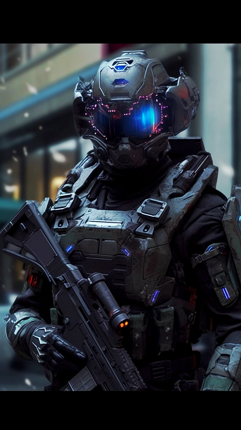 Futuristic soldier with hi-tech armor and weaponry,holograms navigations,street,overcast,reflection mapping,intricate design and details,dramatic lighting,hyperrealism,photorealistic,cinematic,8k,unreal engine --ar 9:16 --s 750